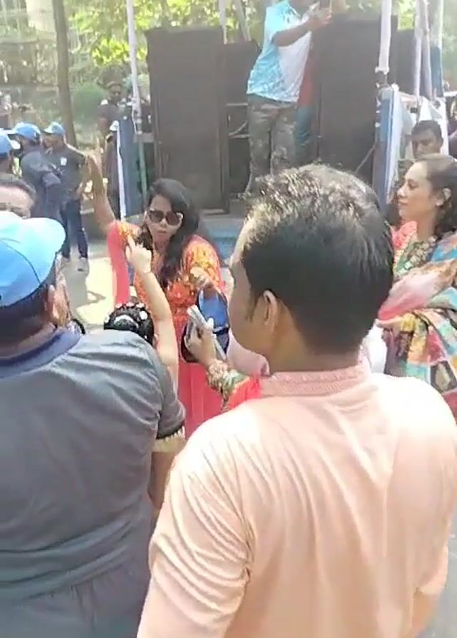 Here is a detailed description of the video: The video shows an outdoor celebration with a lively crowd, likely a public event or festival. People are dressed in colorful attire, including saris, shirts, and casual wear. Many individuals wear matching light blue caps, possibly indicating they are part of a group or organization. A large speaker system is set up, suggesting music or entertainment is a central part of the event. Several people are actively dancing and interacting with each other, creating a festive atmosphere. Some individuals are eating or drinking, adding to the celebratory mood. The background features a building, which might be a hotel or tourist facility, indicated by signage. There are also trees and other greenery in the vicinity, suggesting a park or open space. Some people are taking pictures or videos with their phones, capturing the event. The camera moves through the crowd, providing a dynamic perspective of the celebration. The overall atmosphere is joyful and communal, with people actively engaging and enjoying the event.