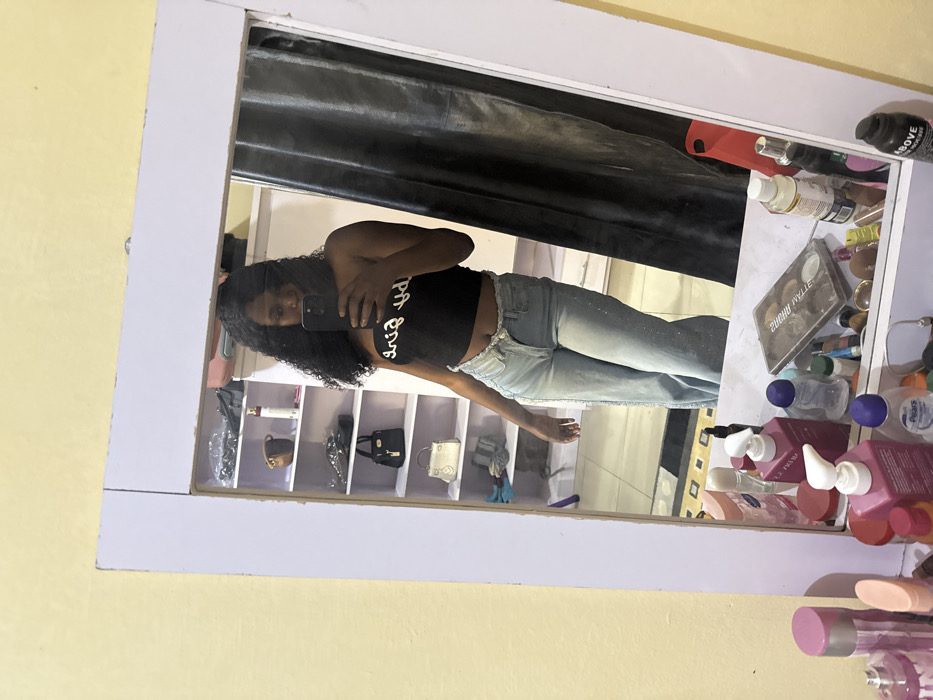 A woman is reflected in a mirror, taking a selfie. She's wearing a black top with white lettering and light-wash jeans. Shelves with various handbags are visible behind her. The right side of the mirror's surface has a cluttered array of cosmetics and toiletries. A dark curtain drapes above her head in the mirror. The mirror has a white frame and is mounted on a yellow wall. The image is rotated counter-clockwise.