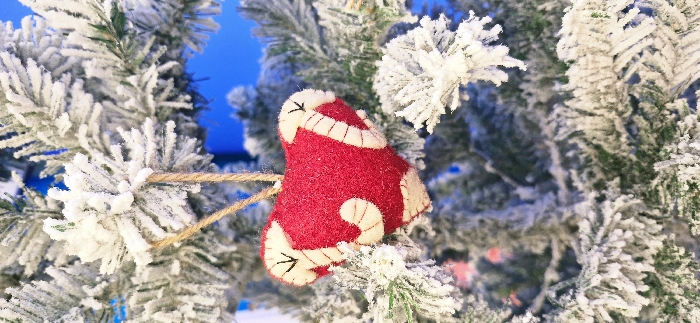 - "A felt Christmas ornament hangs on a flocked tree" by FM-uLzcF2, licensed under CC BY 4.0