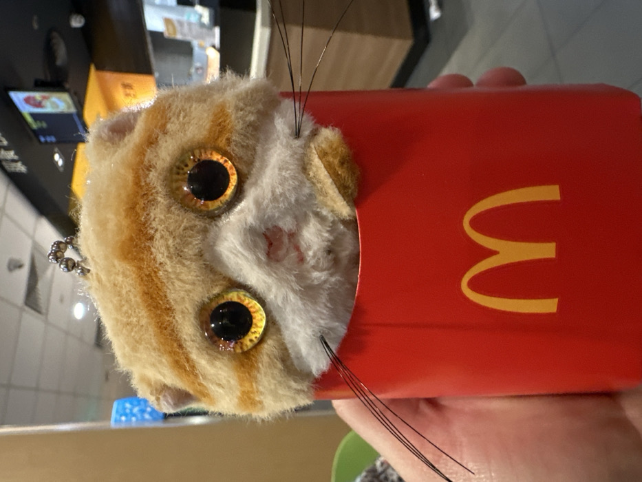 - "The image presents a close-up, eye-level view of a plush toy held within a red McDonald's french fry carton against the blurred background of a McDonald's restaurant interior in Xihu District, China" by FM-9vwe03, licensed under CC BY 4.0