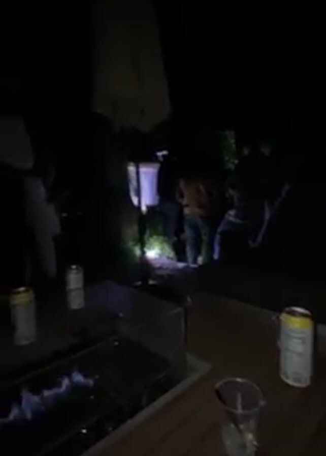 The video depicts an outdoor gathering at night. Several people are visible in the background, illuminated by a spotlight. The scene includes a fire pit with flames, along with beverage cans and a plastic cup on a wooden surface. A potted plant is illuminated with blue light. The overall atmosphere appears dark and social.