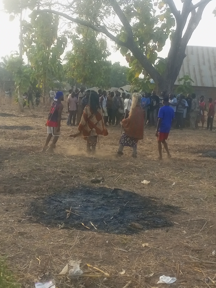 A group of people stand in a dirt field, with two figures at the center wearing costumes. Dust is kicked up around their feet as they appear to be performing a ritual or dance. A burned patch of ground is visible in the foreground. In the background, a crowd watches, with trees and a building partially visible. The lighting suggests it's either early morning or late afternoon.