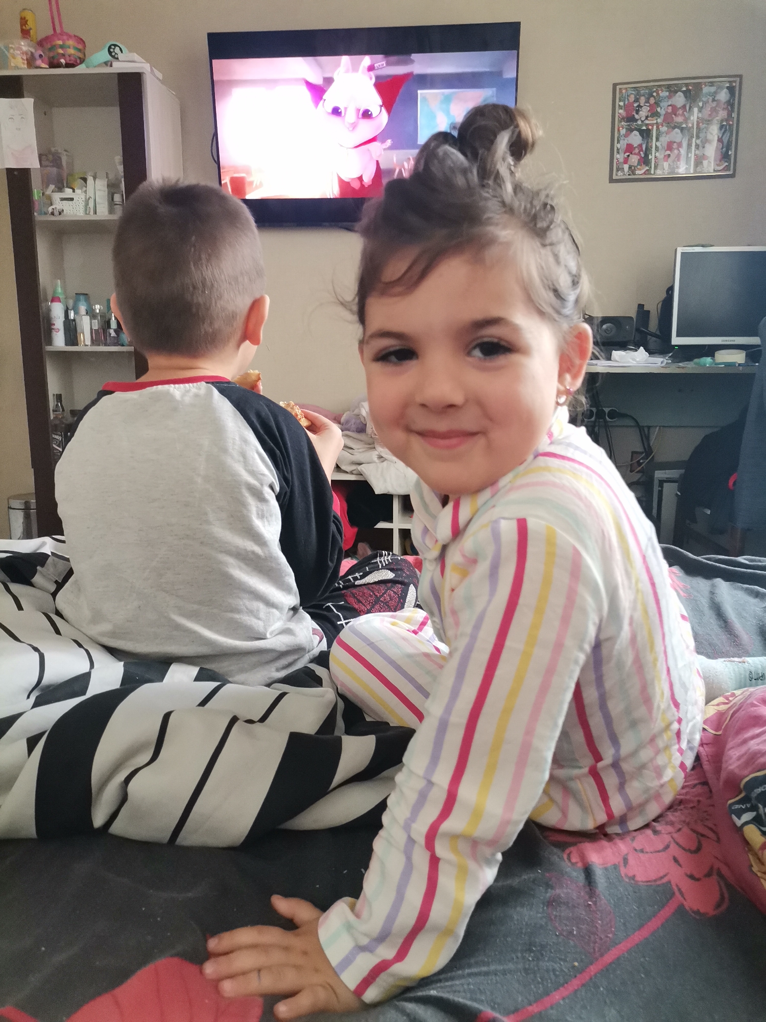 The image depicts two children seated on a bed within a domestic indoor setting in Obrochishte, Bulgaria