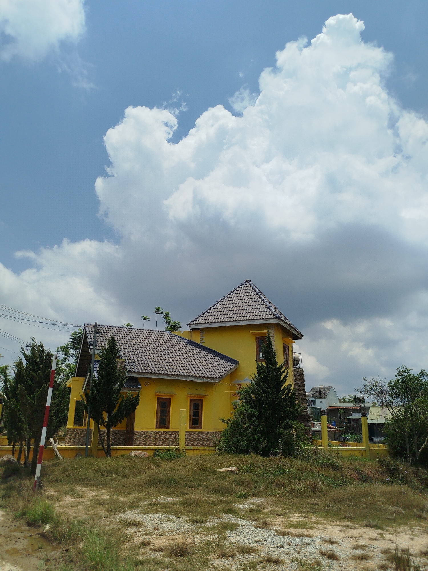 The scene depicts a two-story yellow building in Trường Thọ, Vietnam. The building has a brown-tiled roof and is surrounded by a yellow fence. Several trees, including some coniferous varieties, stand in front of the building. The sky is filled with white and gray clouds. The foreground consists of dry grass and gravel. A red and white striped pole stands near the edge of the road. Other buildings are visible in the background. There are no people visible in the frame.