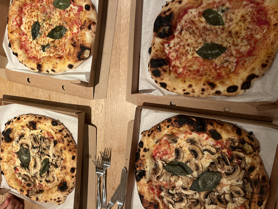 Four pizzas in cardboard boxes sit on a light wooden surface. Two appear to be topped with tomato sauce and basil. The other two feature mushrooms, and one contains a glimpse of tomato sauce. Silver forks and a knife rest between the two pizzas on the bottom. The pizza crusts are charred, and the toppings appear fresh.