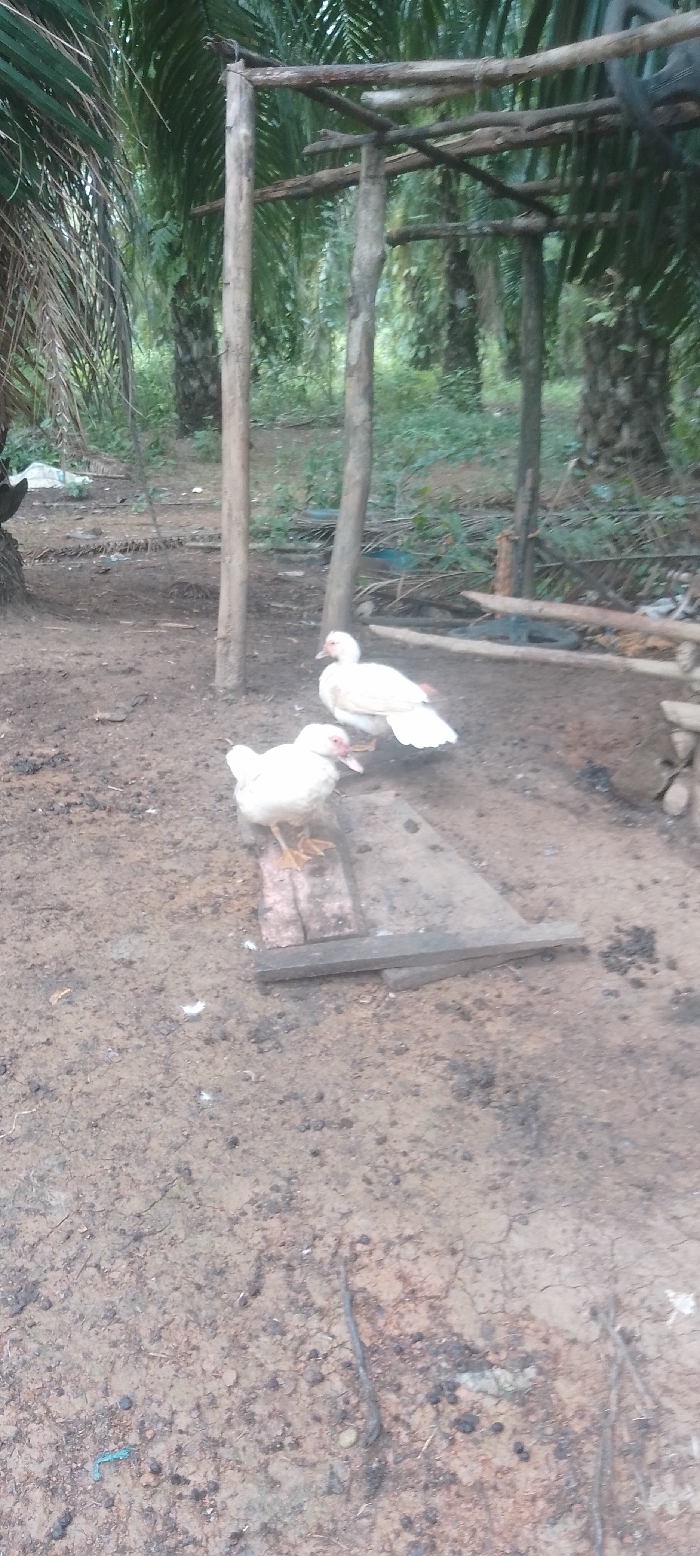 Two white Muscovy ducks stand in a dirt clearing. The one in the foreground is perched on a wooden plank. A rudimentary wooden structure with upright posts and horizontal supports is visible in the background, surrounded by lush green foliage and palm trees. The ground is mostly bare dirt, with scattered twigs and small debris. The scene is rural and appears to be a backyard or farm setting.