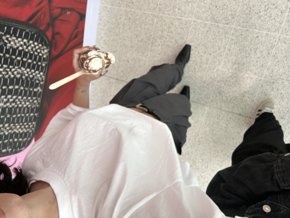 This image depicts an indoor commercial setting, likely within a shopping center or retail establishment in Watford, United Kingdom. The primary subject, viewed from a high angle, is visible from the mid-torso downwards. They are wearing a white oversized short-sleeved top, dark grey baggy trousers, and black square-toed flat shoes on their right foot. Their right hand holds a clear plastic cup filled with vanilla ice cream, generously topped with a dark syrup (likely caramel or chocolate) and whipped cream, with a wooden spoon inserted. A small, dark tattoo is visible on their right forearm, and their fingernails are painted a light color. To the lower left, the lower leg and foot of a second individual are partially visible. This person is wearing black trousers or jeans and a white sneaker with three distinct black stripes, indicative of an Adidas brand shoe. The flooring consists of light grey square tiles. The background features a vibrant red wall adorned with a large black and white graphic pattern, which appears to be a stylized representation of a quilted or woven texture, possibly depicting a handbag. No precise address or specific landmark is identifiable from the visible elements.