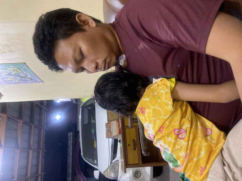 The image depicts a nighttime scene in Sumorame, Indonesia, featuring an adult male and a child. The man, with dark hair and a short beard, is seated in a brown armchair, wearing a maroon short-sleeved t-shirt, with his eyes closed, indicating sleep or rest. A child, dressed in a yellow top with a floral pattern and light-colored pants, is leaning against the man's chest with her head resting on his shoulder, also appearing to be asleep or resting. Her back is to the camera. In the mid-ground, a small wooden desk with a single drawer is visible, on which a desktop calendar stands. Behind this desk, a white multi-purpose vehicle is parked, partially visible. The background features a light-colored wall with a green and white poster affixed to it. Above the vehicle, an exposed roof structure with wooden rafters is visible against a dark night sky, illuminated by a bright, uncovered light source in the upper left. The overall setting suggests a semi-outdoor or covered porch area of a residence or small establishment.