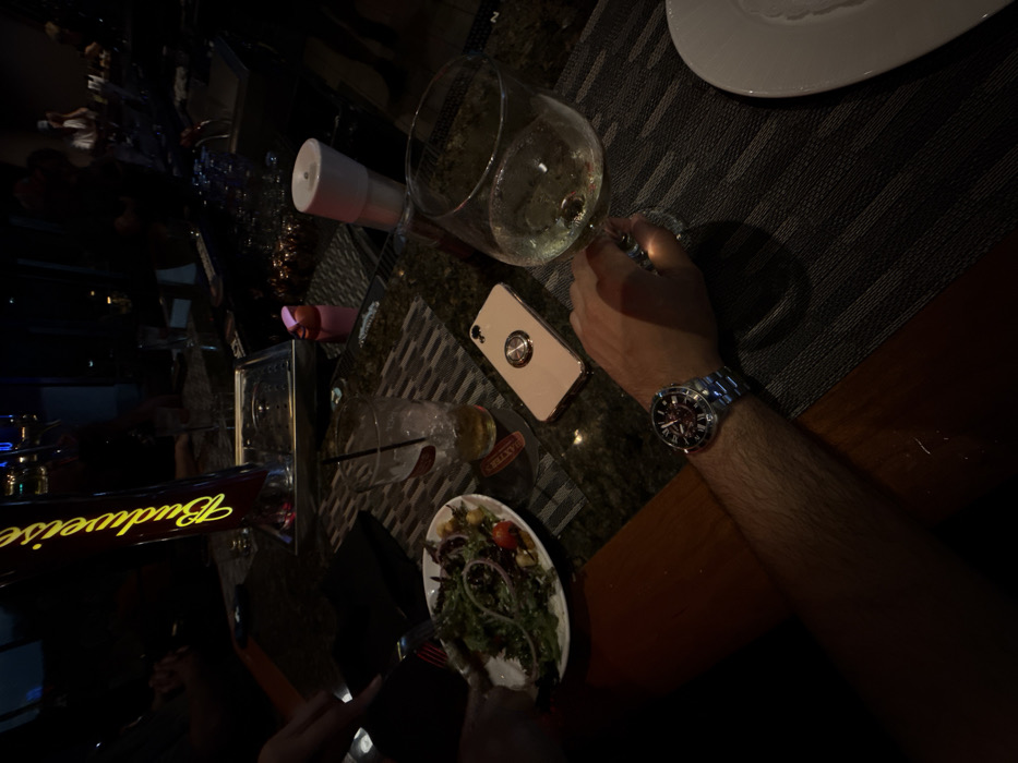The image depicts an interior scene at a bar or restaurant, identified as Baxter's Lakeside Grille, located at 1229 Bagnell Dam Blvd, Lake Ozark, Missouri, United States. The lighting is dim, suggesting evening hours. In the foreground, a person's left forearm is visible, adorned with a metallic wristwatch featuring a dark dial and red accents. This individual holds a stemless wine glass containing white wine. To the left, another person's hands are observed using a fork and knife to consume a salad from a white oval plate. The salad consists of mixed greens, red onion, cherry tomatoes, and croutons. Arranged on the dark, speckled bar counter, atop dark, textured placemats, are several objects. These include an empty, tall clear glass with a straw and residual liquid, resting on a round coaster labeled "BAXTER". Adjacent to it is a light-colored smartphone, facedown, equipped with a circular pop socket. Prominently positioned further back on the bar is a red and yellow "Budweiser" beer tap handle above a metal drip tray. Blurred elements in the background include additional glassware, bottles, a small pink container, and a white insulated cup, all indicative of a typical bar environment.