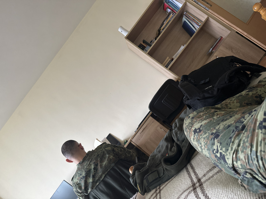 An interior scene depicts two individuals in a room. In the foreground, a person's legs, clad in digital camouflage trousers, are visible, resting on a light-colored plaid blanket. Adjacent to the legs are a dark olive-green fleece jacket and a black backpack. A small, orange-brown spherical object rests on the blanket. In the midground, another individual is seated with their back to the viewer. This person has a closely-shaved head with a visible red mark on the rear scalp. They are wearing a digital camouflage shirt, and a dark garment is draped over their lower back. They appear to be focused downwards, possibly at an object on a surface in front of them. The background features light beige walls. To the left, behind the seated individual, is a light wooden chest of drawers or desk with a dark monitor on top. To the right, a light wooden bookshelf with multiple shelves is filled with books and papers. A white, dispenser-like object stands on the top shelf of the bookshelf. A dark-colored chair or stool is positioned between the desk and the bookshelf. A partial view of a wooden door frame is visible on the far right. The image contains no visual elements to confirm the specific location as Veliko Tarnovo, Bulgaria.