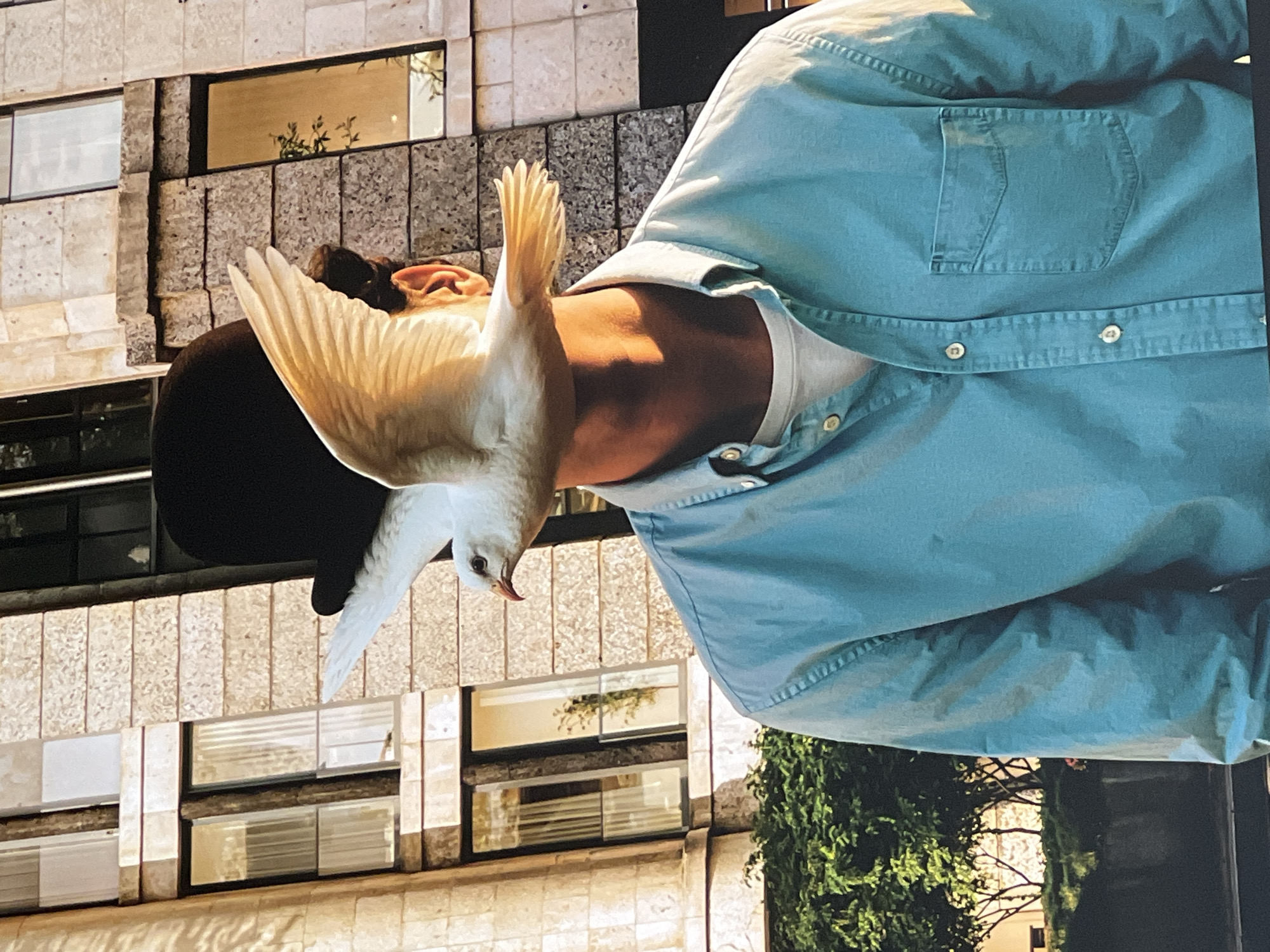 The image depicts a male individual and a white seagull in an urban setting within the historic city center of Saint Petersburg, Russia. The human subject, positioned centrally, is visible from the upper chest upwards. He wears a light blue, long-sleeved button-down shirt over a white undershirt, with his right ear and neck exposed. His head is adorned with a dark, possibly black, bowler hat. A white seagull is captured in mid-flight directly in front of the individual's face, completely obscuring it. The bird has outstretched wings, a light body, and a reddish-orange beak, appearing to fly horizontally across the frame. The background consists of a multi-story building featuring a light-colored, block-patterned stone facade, characteristic of Saint Petersburg's historic architecture. Multiple dark-framed rectangular windows are visible, some reflecting the sky and distant trees, others showing interior elements or vertical blinds. A vertical architectural element, possibly a pilaster or column, is partially visible on the far left. Green foliage, consistent with urban landscaping, is present at the bottom left, in front of the building. The scene is illuminated by strong, warm directional sunlight, creating highlights on the seagull, the man's neck, and sections of the building facade. The perspective is a medium close-up, creating an optical effect where the seagull's body serves as the man's face.