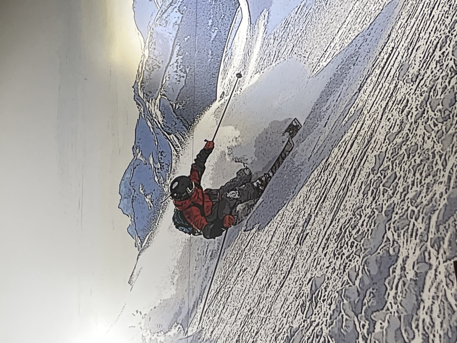 A skier in red and black gear descends a steep, snow-covered mountain face. They are angled sharply, kicking up spray with their skis, holding a ski pole. The mountain is sharply defined, with jagged lines that make up snow and rock formations. Light shines from the top and bottom of the image, suggesting a bright but overcast day. The image style appears illustrative with bold outlines.