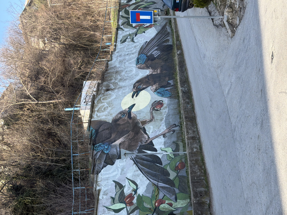An outdoor scene in Veliko Tarnovo, Bulgaria, depicts a colorful mural painted on a concrete retaining wall that runs parallel to a paved street. The mural features two large birds, possibly jays or nutcrackers, with brown bodies and distinctive bright blue markings on their wings and around their eyes. The bird on the left is captured in mid-flight, descending with outstretched wings, and is holding a single red, round fruit in its talons. A pale yellow circular shape is positioned behind this bird. The bird on the right is crouched or perched lower, facing the first bird with its beak open, as if in anticipation of receiving the fruit. Green foliage with clusters of red berries or fruits frames the birds on both sides of the mural. Below the mural, a grey asphalt or concrete street runs horizontally across the foreground, separated from the wall by a low concrete curb. On the right side of the street, a blue rectangular road sign with a white horizontal bar, indicating a "Dead End," is mounted on a metal pole. The rear bumper and a portion of the right rear wheel of a dark-colored vehicle, bearing a Bulgarian license plate, are visible behind the sign. Above the mural, the top of the retaining wall features a light blue metal railing. Beyond this railing, a steep hillside rises sharply, densely covered with numerous bare deciduous trees and shrubs, characteristic of winter or early spring. The scene is illuminated by direct sunlight, casting shadows on the street. No people are visible.