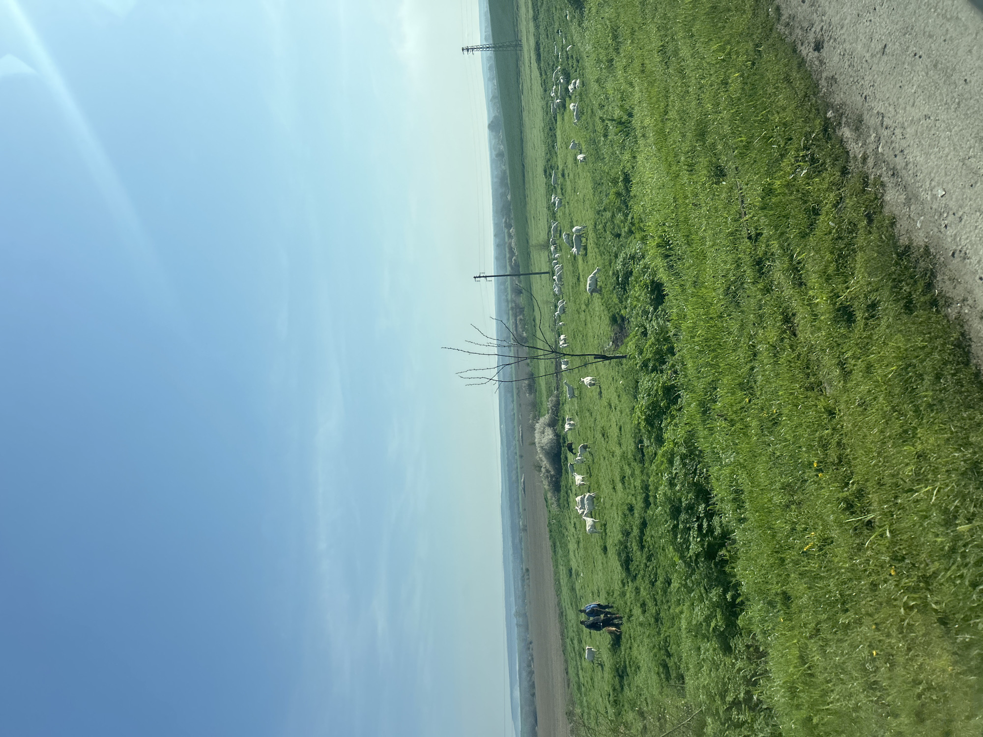 daytime view of a grassy field in Grozdiovo, Bulgaria, likely agricultural land or pasture. The sky is blue with some cloud cover, and sunlight is visible. Power lines run across the landscape. A flock of animals, possibly sheep or goats, is dispersed across the field. A few individuals are gathered near the bottom edge of the frame. A bare tree stands near the middle ground. To the right, a paved road borders the field.