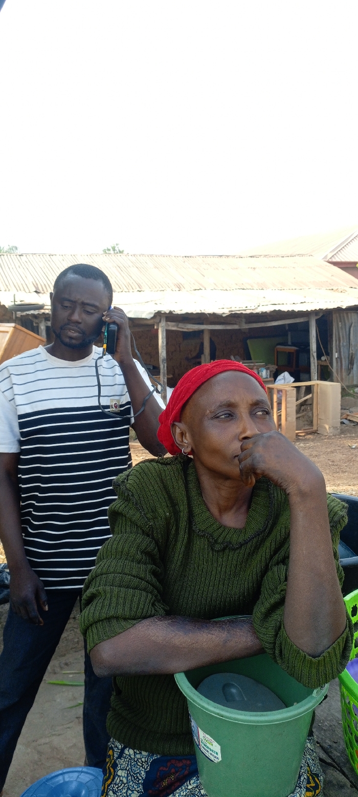 This image depicts an outdoor scene in Kachia, Nigeria, featuring two individuals against a backdrop of basic structures
