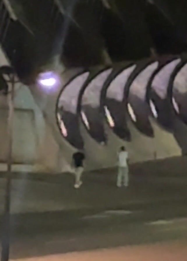 two individuals walking under a structure with repeated arched openings at night. The lighting is dim, with some light sources visible. The individuals are walking at a distance from the camera, making it difficult to discern specific details about their appearance or actions. The arched structure has a repetitive pattern. The overall environment appears urban, possibly under a bridge or elevated structure.