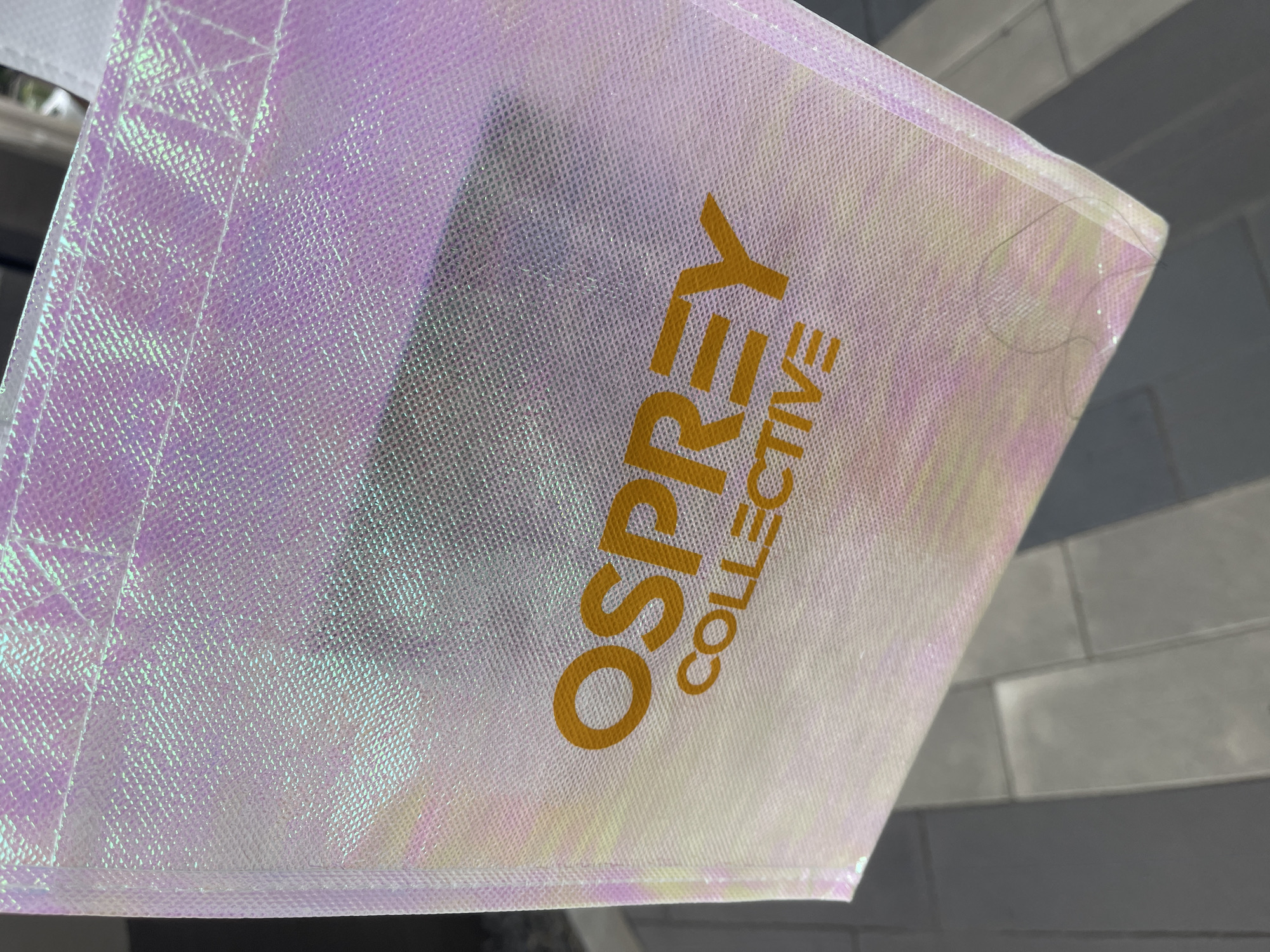 close-up of a light pink iridescent tote bag with the words "OSPREY" and "COLLECTIVE" printed on it in gold lettering