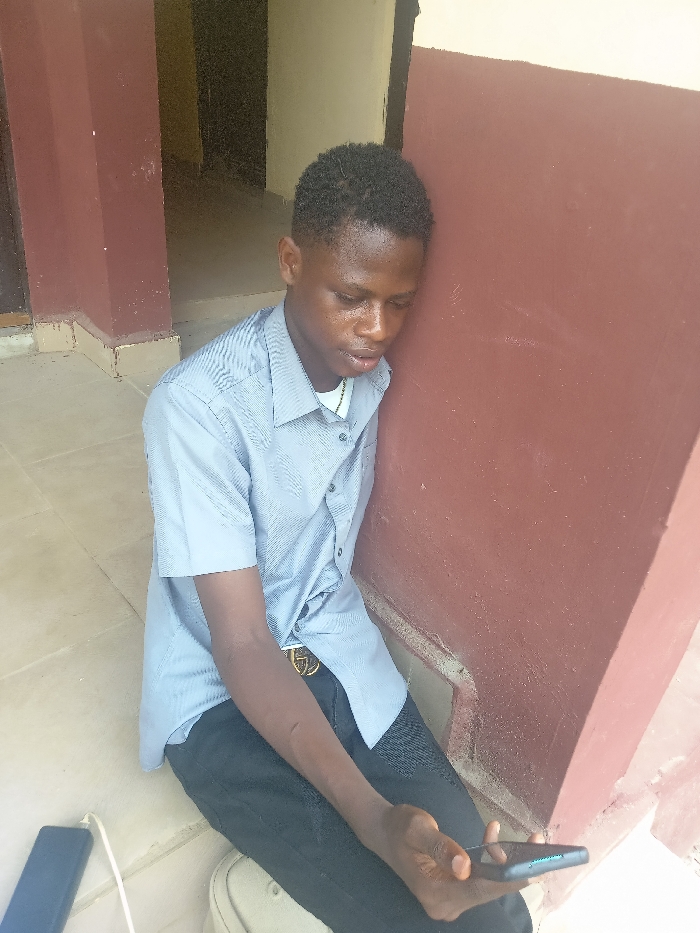 A young adult male is depicted seated on a light-colored tiled floor, leaning against a reddish-brown wall. He possesses short, dark, curly hair and is wearing a light grey short-sleeved collared shirt, black trousers secured by a belt with a gold-toned "G" buckle, and a light-colored necklace. His gaze is directed downwards towards a dark-colored smartphone held in his left hand. A dark blue rectangular object, likely a power bank, rests on the floor to his left, connected by a white cable, potentially to the smartphone or a power source. Partially visible light-colored footwear is on his left foot. The background includes a lighter, possibly cream or beige, wall or doorway. The scene is situated in Nsugbe, Nigeria.