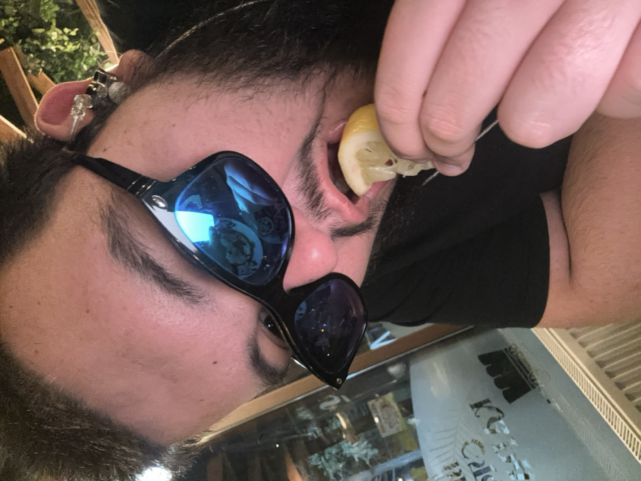 The scene depicts a close-up, angled view of a male individual indoors, identified as being in the city of Stara Zagora, Bulgaria. The subject, exhibiting dark hair, a beard, and a mustache, is wearing dark sunglasses with blue reflective lenses and a black short-sleeved t-shirt. Multiple small, clear, and metallic piercings are visible on the helix and antihelix of his right ear. He is actively biting or sucking on a wedge of yellow lemon, which is held by a thin, metallic skewer or toothpick positioned between his right thumb and index finger. His mouth is open, revealing the lemon pulp. The background to the viewer's left features a windowpane, below which a white radiator is present. Partially visible Cyrillic text and a crown logo are faintly legible on the window, consistent with a commercial establishment. Reflections within the sunglasses show an indoor dining environment, including what appear to be plates of food and portions of a table setting. The overall lighting suggests an interior, possibly evening, setting.