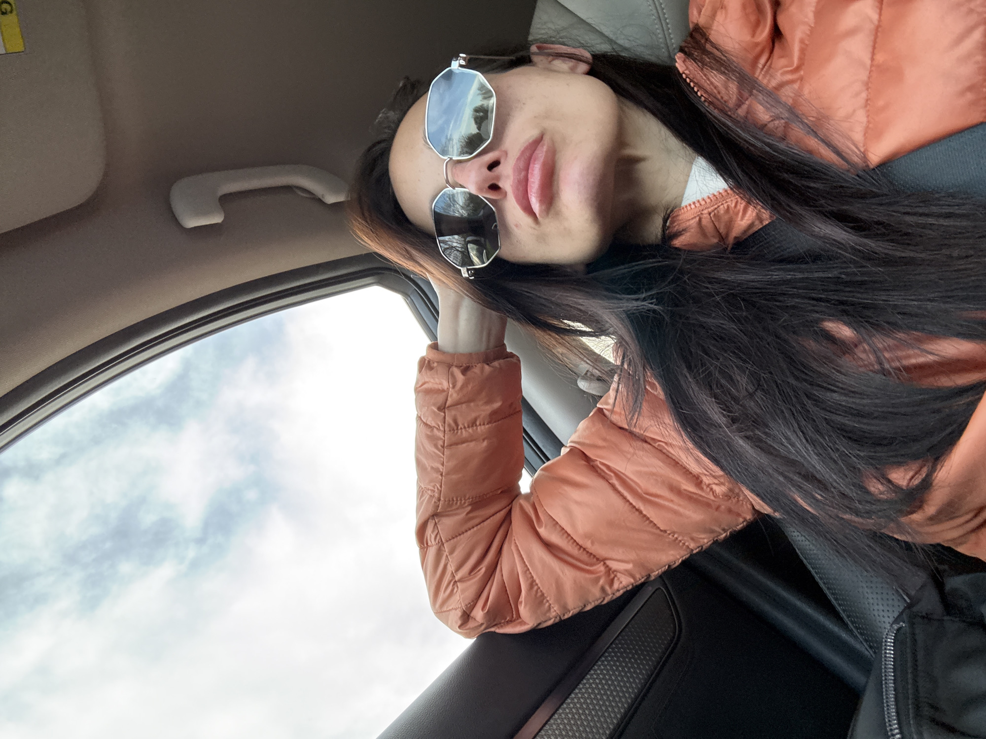 A woman wearing sunglasses and a peach-colored puffy jacket is resting her head on her arm inside a car