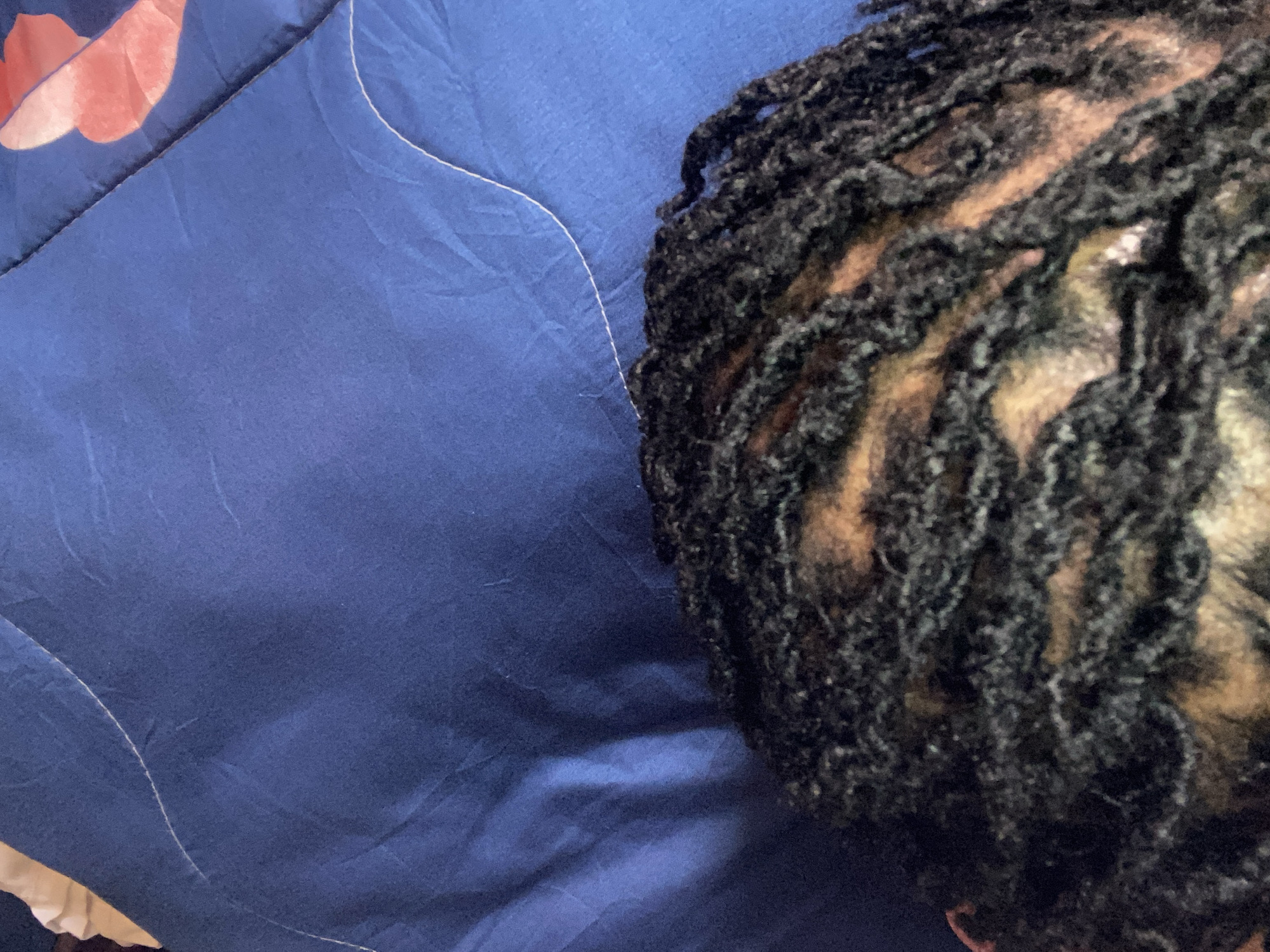 The image presents a close-up, top-down perspective primarily focused on the upper scalp and hair of an individual. The hair is styled in numerous dark, tightly woven dreadlocks, revealing sections of light brown scalp between them. The head is situated against a dark blue fabric background, likely bedding such as a blanket or duvet, which displays folds and a visible white stitch line in the upper left quadrant. A partial, curvilinear pattern in red-orange is visible on the blue fabric in the upper right. The specific location within Narayi, Nigeria, cannot be determined from the visual content of this image.