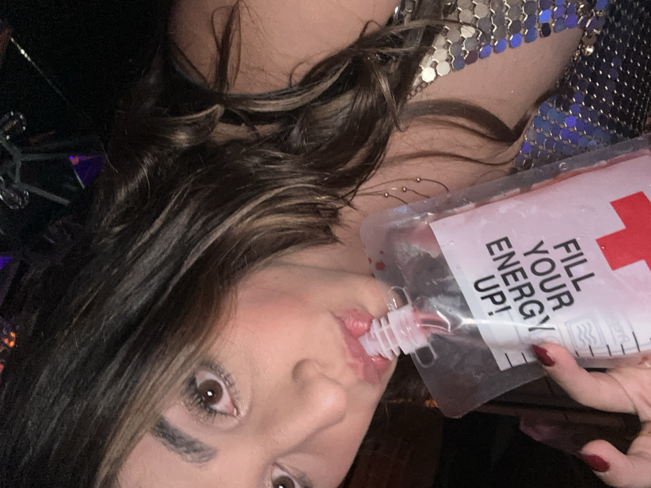 A female subject is depicted in a close-up shot, consuming a reddish liquid from a transparent, flexible pouch designed to resemble a medical blood bag, labeled with "FILL YOUR ENERGY UP!" and a red cross symbol. Her lips are pursed around the white spout of the pouch, which she holds with her right hand, displaying dark red painted fingernails. She has long, dark brown hair with lighter highlights and visible makeup around her brown eyes. The subject is wearing a top adorned with numerous small, reflective, hexagonal or circular metallic embellishments, possibly sequins or scales. The background is dark and out of focus, with subtle reflections suggesting an indoor environment with low ambient lighting, potentially indicating an entertainment venue. The scene takes place in San Bernardino Tlaxcalancingo, Mexico.