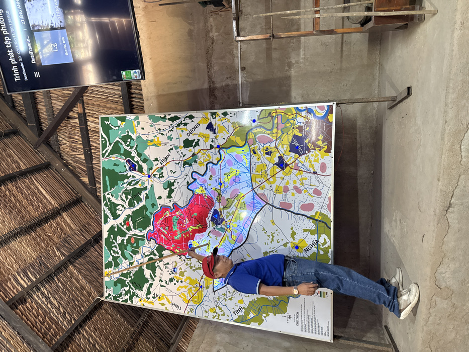 An adult male stands indoors, facing right, in a rustic structure in Ho Chi Minh City, Vietnam