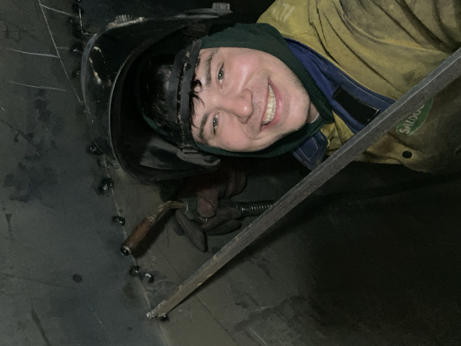 The image depicts a male individual in an industrial setting, likely a fabrication or construction environment