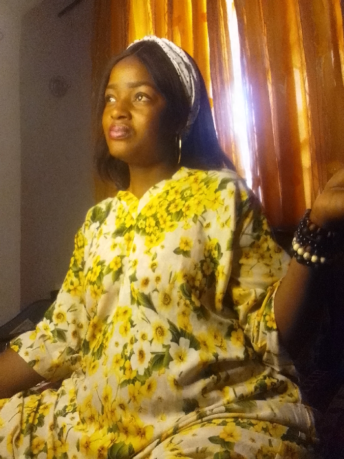 An adult female is depicted in an indoor setting within the city of Unknown, Unknown. She has a medium skin tone, long dark hair partially covered by a white patterned headband, and wears large gold-colored hoop earrings. Her attire consists of a loose-fitting garment with a V-neck, featuring a pattern of yellow and white flowers on a light background. Multiple dark-colored beaded bracelets with lighter accents adorn her left wrist (viewer's right). She is positioned from the chest up, facing slightly right and looking upwards and to the right, away from the camera. Her lips appear glossy or lightly tinted. The background to her left is a shadowed, plain grey wall. To her right, bright light is visible through sheer, orange-colored curtains, suggesting a window. A dark, indistinct object is partially visible in the lower left foreground.
