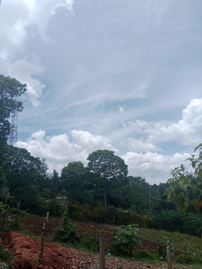 partially cloudy sky over a green, forested hillside in Tenwek, Kenya. There are a few trees in the foreground, including one large tree in the middle of the frame. The image appears to have been taken from a hillside looking up at the sky. The ground is covered in red dirt and there are small bushes scattered around. A cell phone tower stands in the distance. The sky is a pale blue with white clouds, some of which are thick and puffy. The trees are a variety of shades of green, and the branches are silhouetted against the sky. There are no people visible in the image. The location is approximately 0.742 degrees South and 35.358 degrees East.