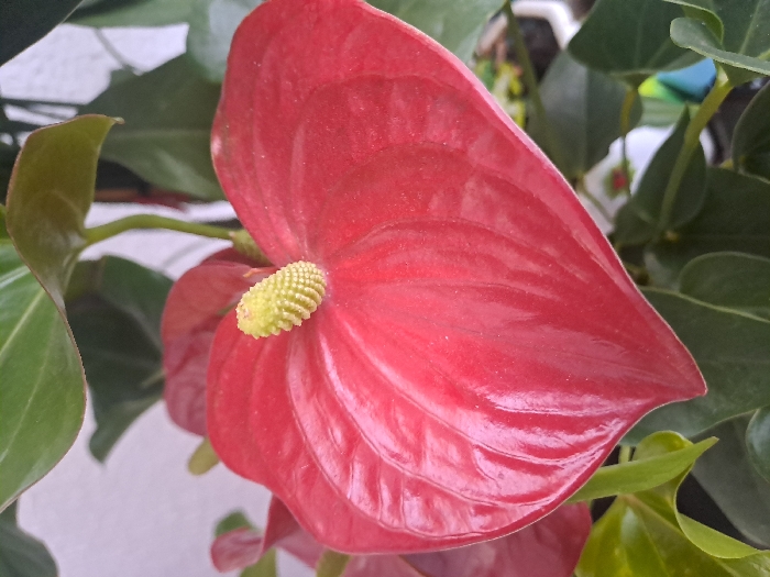 The image displays a close-up view of a vibrant red Anthurium flower, or spathe, prominently positioned in the center. The spathe is heart-shaped with a glossy, waxy surface, showing minor striations and small dust particles. A light green, textured spadix, covered in small bumps, projects vertically from the center of the spathe. Surrounding the primary flower are numerous dark green leaves of the same plant, some in focus and others blurred. A second, out-of-focus red spathe is partially visible on the left side. The background features a light-colored, uniform surface, likely a wall, behind additional blurred green foliage. A portion of a white plant pot is discernible in the lower right background, partially obscured by leaves. No individuals are present. The scene depicts a static plant environment. The precise location within the city of Unknown, Unknown, cannot be determined from the image.