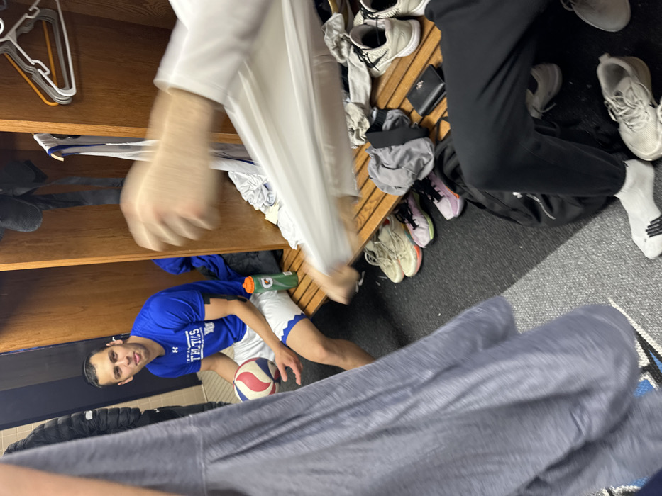 A male athlete wearing a blue athletic shirt sits with a volleyball in a locker room, next to a bench with sneakers and personal items. There is a green Gatorade bottle next to him. Other athletes, partially visible, are also in the locker room; their movements are blurred. The scene appears to be a lively and casual setting.