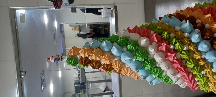 - "A brightly colored, triangular meringue sculpture is the focal point" by FM-GJkLu1, licensed under CC BY 4.0