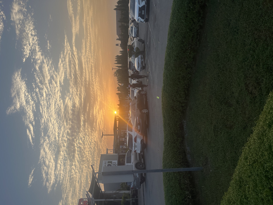 A parking lot filled with various cars is bordered by a thick green hedge. The sky is ablaze with a sunset, featuring striated clouds and a radiant sun partially obscured by trees. Several individuals stand between parked vehicles. A building and a pole are visible on the left side of the frame.