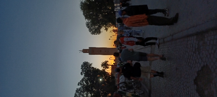 mosque at sunset, with a sky transitioning from blue to orange. There are several people walking on a cobblestone path along the right side of the picture. The minaret of the mosque is the focal point, surrounded by silhouettes of trees and a palm tree. The setting sun creates a vibrant glow around the mosque.