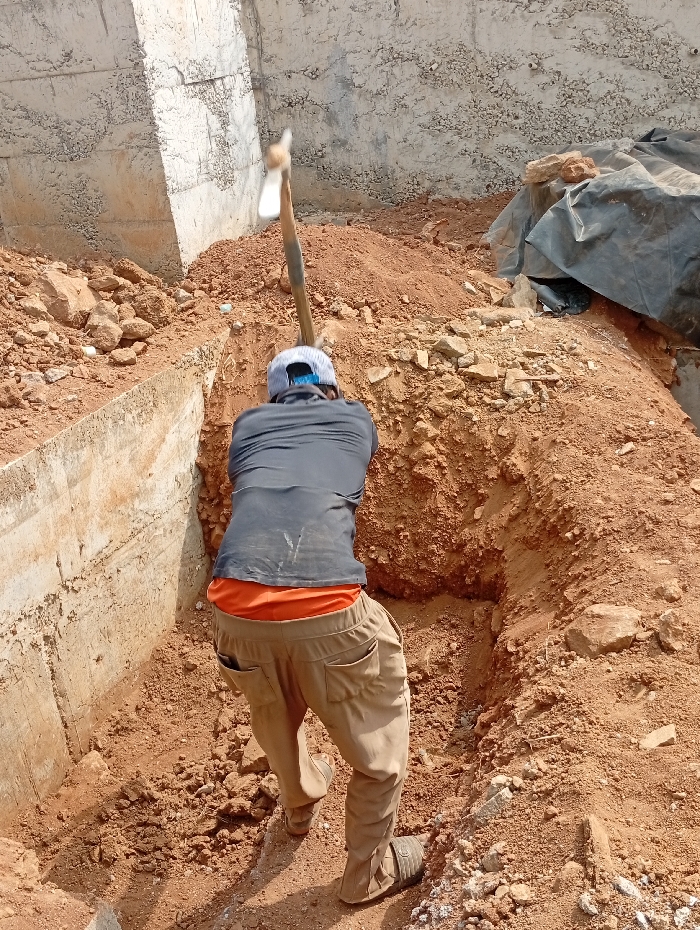 This image depicts an outdoor excavation site in Abuja, Nigeria. A single individual is captured from behind, engaged in manual labor, actively digging reddish-brown earth with a pickaxe. The person wears a dark grey short-sleeved shirt, an orange undershirt visible at the waist, tan baggy pants, and dark sandals. A light-colored baseball cap is worn backwards. The pickaxe, featuring a wooden handle and a metallic head, is positioned mid-swing, indicating a downward striking motion into the soil. The individual stands within a partially excavated trench. To the immediate left, a rough, light-grey concrete wall forms a structural boundary. Piles of loose, reddish-brown soil, mixed with rocks and debris, are distributed around the excavation area. In the background, additional rough concrete structures are visible, suggesting ongoing construction or foundation work. To the upper right, a dark-colored tarp or plastic sheeting is draped over a mound of earth. The scene is characterized by disturbed earth and construction materials under natural light.