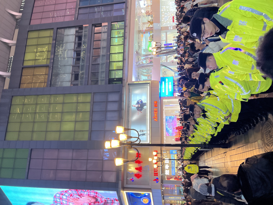 The image captures a crowded, artificially lit nighttime scene on a commercial street in Yuzhong District, China. A multi-story modern building with a segmented glass facade, displaying panels of varying hues including green, yellow, pink, and blue, dominates the background. A large LED screen on the building's upper left displays a person in a plaid shirt, while ground-level storefronts, brightly illuminated, feature signage such as "AÍMER" and a partially visible "HUA" sign. In the midground, a long, orderly line of approximately 20 to 30 individuals, identified as police or security personnel, stands facing slightly towards the right side of the frame. They are uniformly dressed in bright neon yellow high-visibility jackets with reflective stripes and dark caps; some jackets feature Chinese characters. These individuals appear to be forming a barrier or guiding a large public gathering. Behind and to the right of the uniformed line, a dense crowd of civilians occupies the paved pedestrian area. These individuals are dressed in diverse casual attire, consistent with cold weather, and are seen moving or congregating. Multiple ornate streetlights, each featuring five or six upward-curving arms with glowing yellow-orange lamps, provide additional illumination. A metallic, abstract sculptural element is visible on the right side of the street near the building's base, and a manhole cover is discernible on the pavement in the foreground.