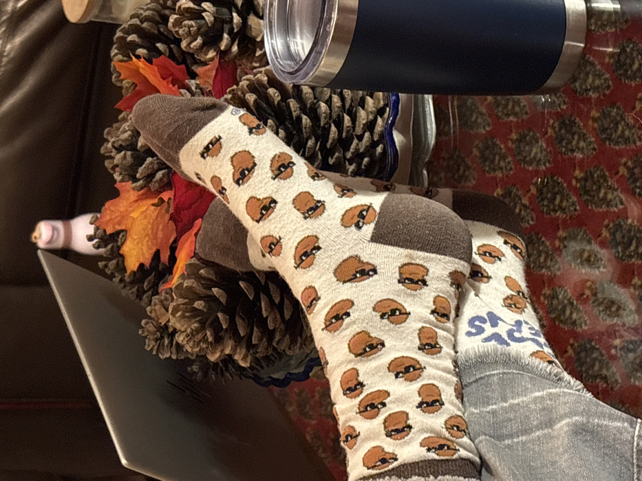 The image depicts an indoor scene in Huasca de Ocampo, Mexico, focusing on the lower legs and feet of one individual positioned in a relaxed, crossed posture. The individual wears light blue denim jeans and white socks with brown heels, toes, and cuffs. The socks are patterned with repeating stylized brown figures, each featuring a dark visor, resembling the character Chewbacca. Blue text partially visible on the left sock reads "STAR WARS". The feet rest upon a reflective, dark red surface patterned with repeating dark, textured shapes, consistent with a glass-top table. To the immediate left of the feet, a silver-colored laptop is propped open. Centered behind the feet is a decorative arrangement composed of numerous natural pinecones and artificial orange and red autumn leaves, contained within a dark blue dish. A small, light pink figurine is partially visible behind this arrangement. To the right, a dark blue insulated tumbler with a metallic silver rim and base stands vertically. The background beyond these elements is dark and blurred, indicating an indoor domestic environment.