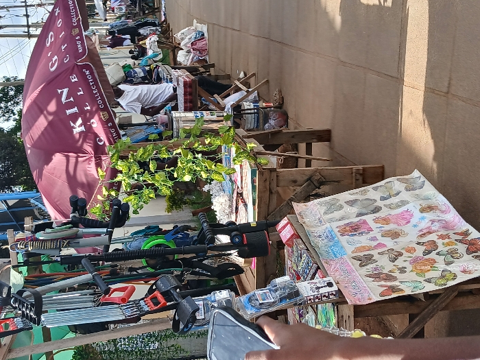 The image portrays an outdoor market scene in the Hospital ward, Kenya, observed during daylight. In the lower-left foreground, a human hand holds a black smartphone, angled towards the market activity. The scene centers on a series of market stalls situated along a light-brown paved walkway. The closest stall on the left features a wooden frame acting as a display rack, from which various items are suspended, including multiple colorful resistance bands, hand grippers, tension springs, and an abdominal exercise roller. Below this, a wooden table holds packaged goods, notably blister-packed headphones, and a vertically hanging poster with illustrations of butterflies, princesses, and dogs. Artificial green leafy garlands are draped around the stall's wooden supports. In the mid-ground, a male individual with dark skin, dressed in a white short-sleeved polo shirt and dark trousers, stands behind a wooden stall. He is partially beneath a large maroon umbrella, branded "KING'S COLLECTION" with a crown logo, providing shade. On his stall, a silver container and several small red containers are visible. Further along the pathway, additional market stalls are discernible, displaying merchandise on tables and in bags placed on the ground. The background reveals overhead utility lines against a bright sky, along with indistinct structures and foliage. The ground throughout the visible area consists of square-cut light brown paving slabs. No direct interactions between individuals are actively depicted.