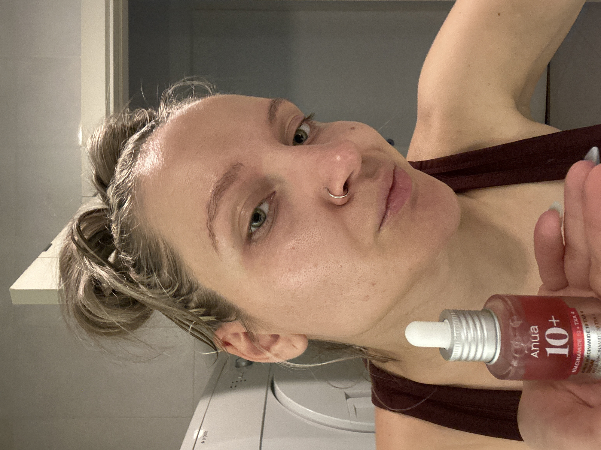A woman with fair skin and light brown hair pulled back in a messy bun is holding a bottle of "Anua 10+ Niacinamide + TXA" skincare serum