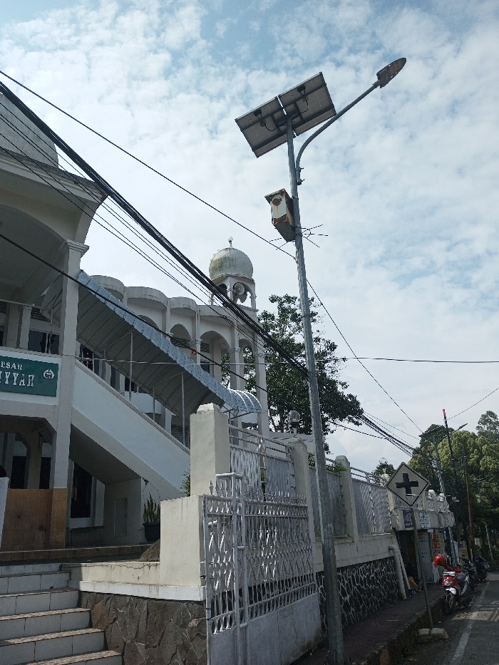 A mosque with a white facade, dome, and arched windows stands adjacent to a staircase leading to a white fence. A solar-powered street light rises beside the fence, wires extending from the building towards it. A road sign indicating an intersection is visible. Motorcycles are parked along the roadside. The sky above is partly cloudy.