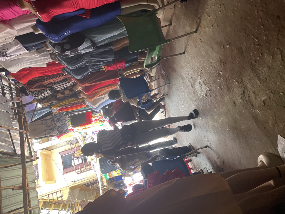 The image captures a detailed view of a bustling market scene in Fegge, Nigeria, observed from within a clothing stall