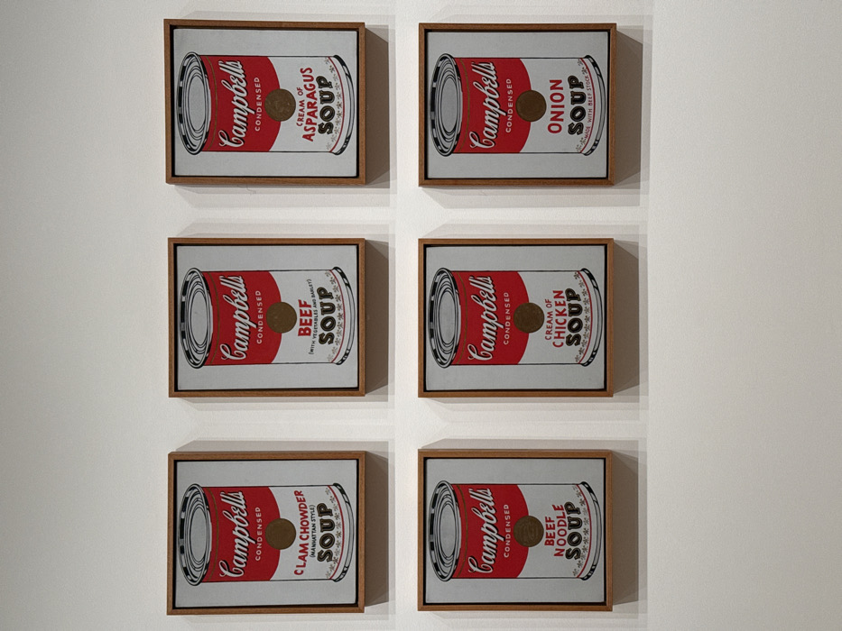 - "Six framed artworks, consistent with Andy Warhol's "Campbell's Soup Cans" series, are displayed on a plain white wall within an art gallery setting" by FM-ZwJu93, licensed under CC BY 4.0