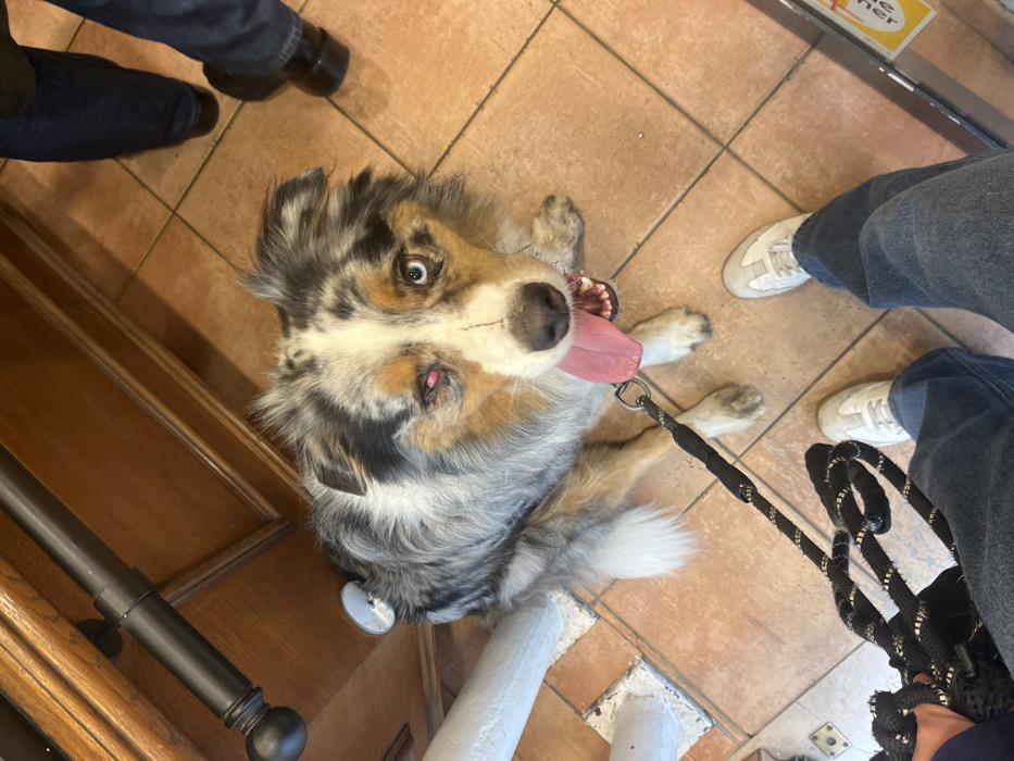 - "A blue merle Australian Shepherd dog, exhibiting a missing or severely damaged right eye and a blue left eye, sits on a reddish-brown tiled floor, looking upward with an open mouth and extended tongue" by FM-OpQwB2, licensed under CC BY 4.0