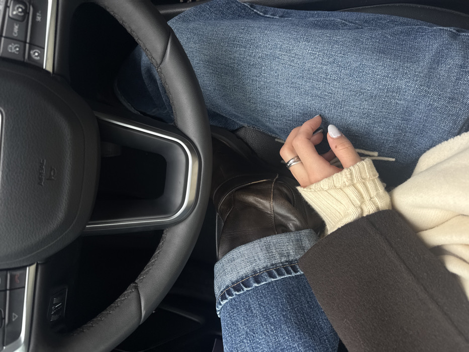 The image depicts the interior of a vehicle, likely a modern car, with a black leather-wrapped steering wheel visible at the top and center, featuring "AIRBAG" text and control buttons on its spokes. The exact location within Mexico City, Mexico, is not discernible from the vehicle's interior. Two individuals are present: 1. **Driver**: The driver's left leg, clad in blue denim jeans with a visible cuff and a dark brown leather boot/shoe, is positioned below the steering wheel. A portion of the driver's right leg, also in blue jeans, is visible to the right. The driver's upper body and hands are out of frame. 2. **Passenger**: The passenger's left forearm and hand are prominently displayed in the foreground, positioned over the driver's right thigh. The passenger wears a cream-colored ribbed sweater sleeve, a dark brown coat sleeve, and holds a cream-colored textile (possibly a blanket or garment). The hand exhibits light-colored nail polish and a silver-toned ring with two intertwined bands on the ring finger. The primary interaction shown is the passenger's hand resting on the driver's leg, indicating close proximity between the two individuals within the car's cabin. The scene is brightly lit, suggesting daylight conditions.