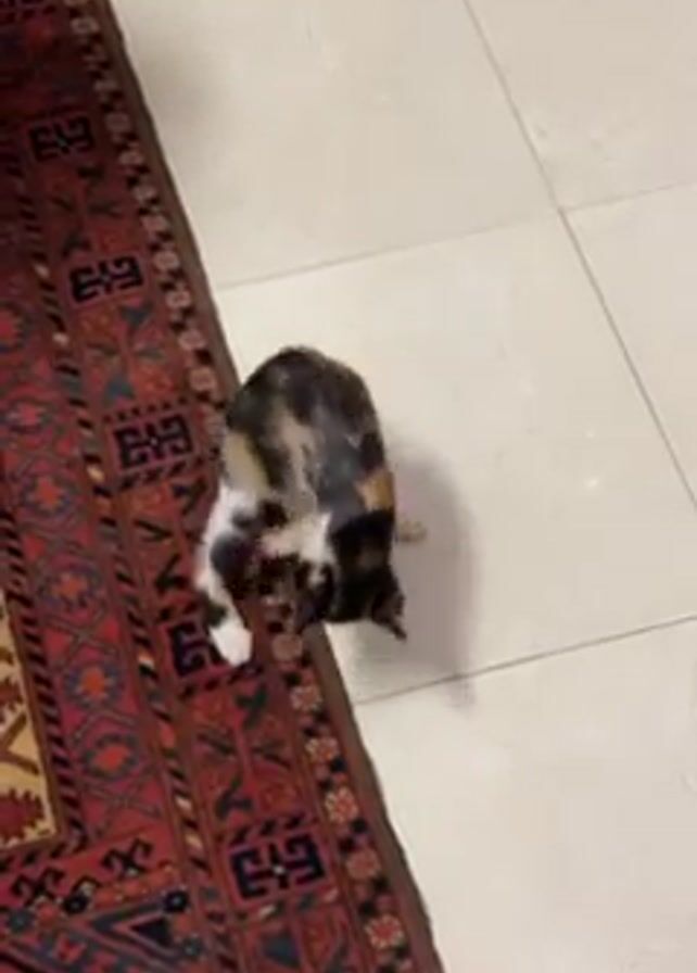 A calico kitten plays with a small brown cylindrical object on a red rug placed on a white tiled floor