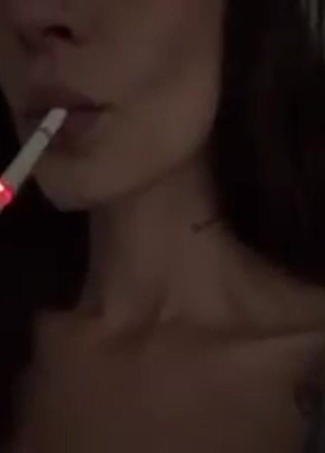 A woman with long brown hair, a nose piercing, and tattoos on her neck and arm is shown from the chest up. She is wearing a gray tank top. She is holding a lit cigarette in her mouth and exhaling smoke. The background is dark and includes a wall and a white object, possibly a piece of furniture.