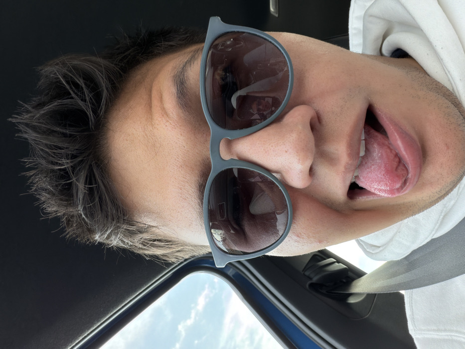 A man wears sunglasses and sticks out his tongue. He has short, dark hair. He's wearing a white hoodie with a gray stripe. A car interior is visible, including the blue frame of the window and a blue sky. The image is rotated, giving a tilted perspective. The sunglasses have a gray frame. The man's face is close to the camera, making his features prominent.