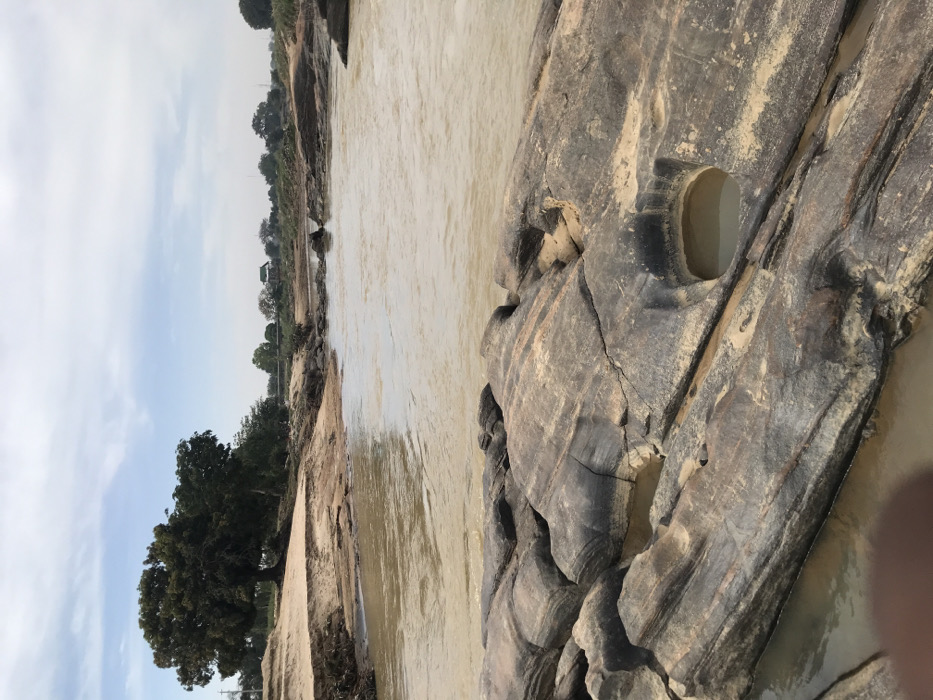 This image depicts a wide, brownish-tan river flowing through a rocky and sandy landscape in Barden Yana, Nigeria, under a partially cloudy sky. In the foreground, large, dark grey rock formations with distinct striations and erosion patterns are partially submerged in the water. A prominent, nearly circular depression, or pothole, filled with water is visible in one of these rocks on the right. The river occupies the midground, showing subtle ripples on its surface, indicating flow. On the left bank, a steep, eroded sandy bank rises, topped by a large, mature tree with dense green foliage. Further along this bank, other trees and shrubs are visible. The distant background, across the river, reveals a lower, less defined shoreline with scattered trees and sparse vegetation. A small structure, possibly a building with a green roof, is discernible amidst the distant trees near the center-right horizon. No people or immediate human activities are visible within the frame.