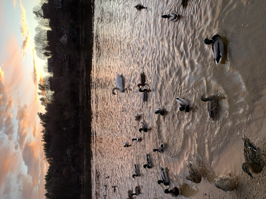 The image captures a riverside scene at dawn or dusk on the Neman River in Hrodna, Belarus. The sky is illuminated with an orange-pink gradient transitioning to pale blue, featuring scattered clouds. The river's surface reflects these warm colors, appearing coppery and displaying numerous small ripples. In the mid-ground water, a single white swan swims towards the left. Surrounding the swan and extending to the sandy foreground are approximately 30-40 mallard ducks. These include drakes with distinctive green heads and grey bodies, and hens with mottled brown plumage. Many ducks are swimming in the water, some actively creating small splashes and ripples. Several ducks are partially or fully positioned on the sandy bank in the immediate foreground, some appearing to stand while others are partially submerged at the water's edge. The far bank of the river is lined with a dense growth of dark, bare deciduous trees, suggesting late autumn or winter. Among these trees, on an elevated section of the bank, several single-story houses with dark roofs are discernible, partially silhouetted against the horizon.